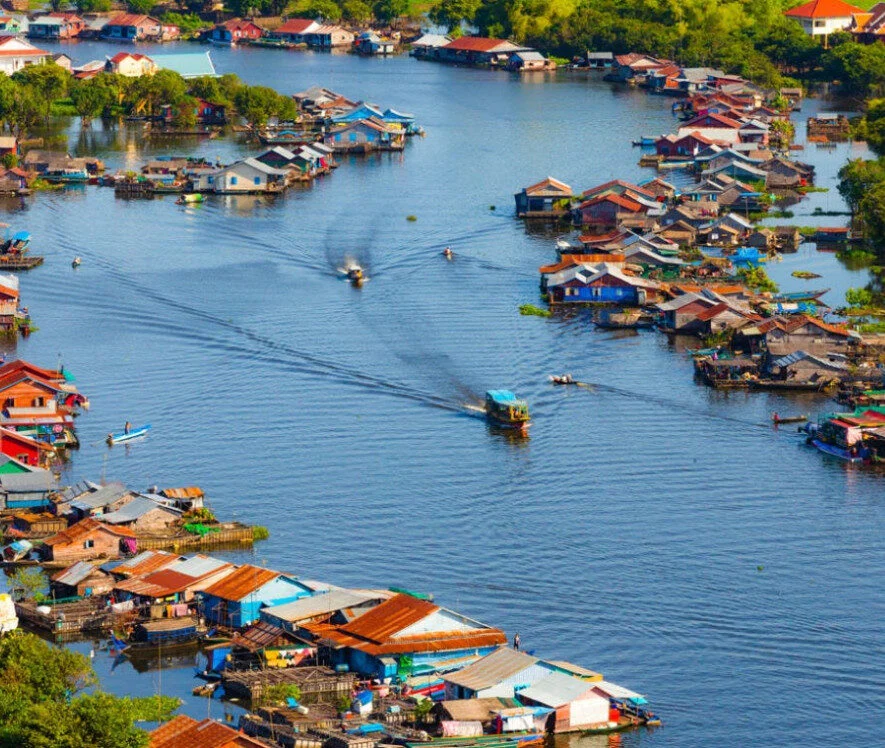 Drive to Cambodia's Great Lake, the Boeung Tonle Sap. One of the largest freshwater lakes in Asia, it stretches across the northwest section of the country. During the wet season, the surface area of the lake increases more than five-fold, inundating the surrounding forested flood plain. More than 1 million people live in this transition zone, among them members of the majority Khmer ethnicity, ethnic Vietnamese, and Muslim Cham. These people thrive on the lake by adapting their entire life to a floating world: markets, schools, churches, flower gardens, vegetable farms, livestock cages, and even police stations literally float on the water's surface.
